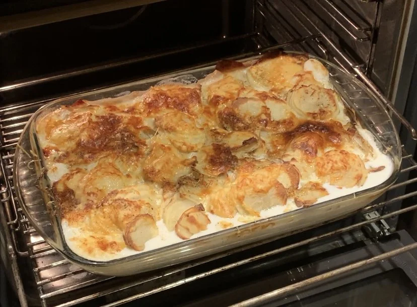 Roasted sliced potatoes with onions, garlic and gruyère.
